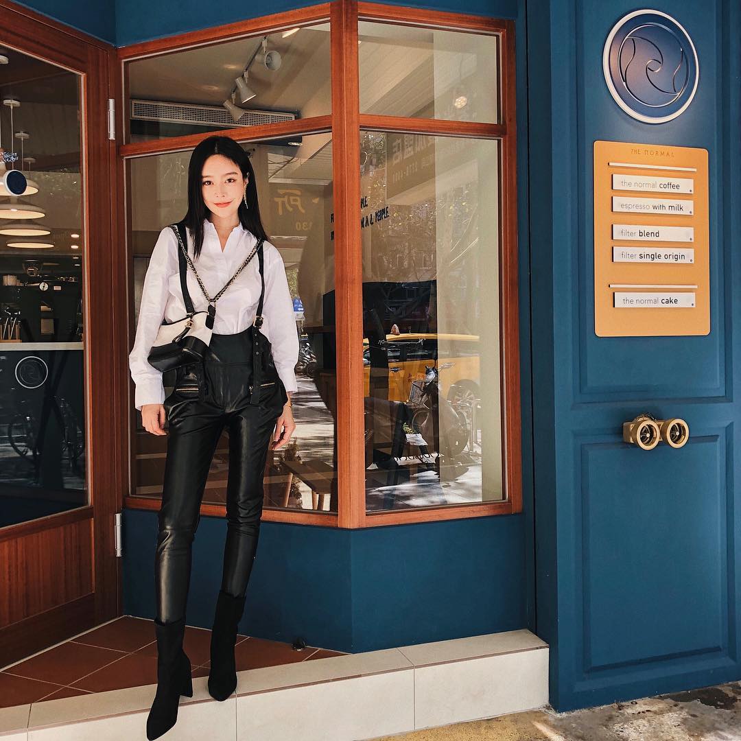 -fitted blouse, leather pants, heeled boots